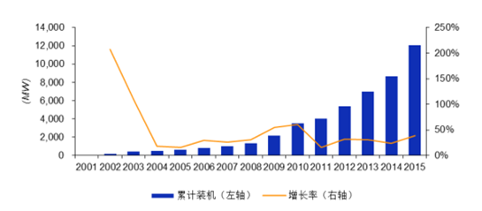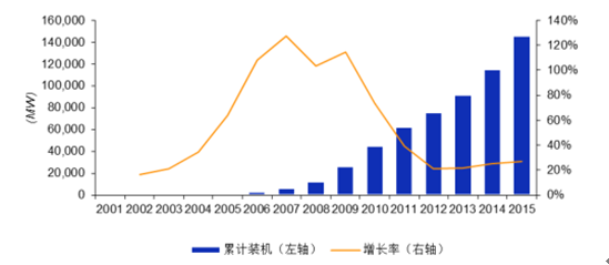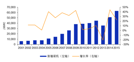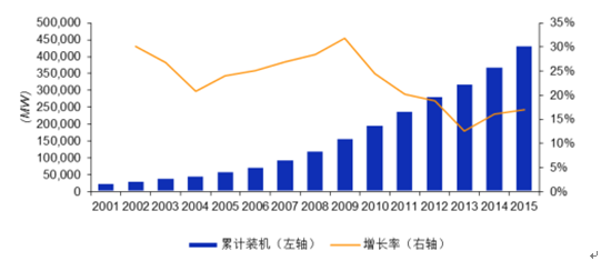 据全球风能理事会的统计,2010 年,我国除台湾省以外共新增风电机组 12,904台,新增装机容量达 18,928MW,2011 年新增装机容量 18,000MW,保持全球新增装机容量第一的排名,2012 年新增装机容量 12,960MW,位列全球新增装机容量第二位,2013 年新增装机容量 16,100 MW、2014 年新增装机容量 23,196 MW、2015年新增装机容量 30,753MW,连续三年保持全球新增装机容量第一位。2010 年底我国累计风电装机容量为 44,733MW,全球累计装机容量排名由 2008 年的第 4 位、2009 年的第 2 位上升到第 1 位。2014 年和 2015 年底我国累计风电装机容量分别为 114,609 MW 和 145,362MW,均保持全球第一。2013 年至 2015 年累计装机容量增长率分别为 21.36%、25.37%和 26.83%,2001 年至 2015 年我国风电累计装机容量及年增长率如下图所示: