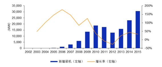 2002 年至 2015 年,我国风电年度新增装机容量及增长率如下表所示: