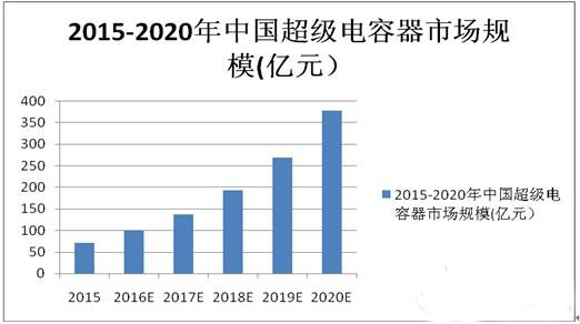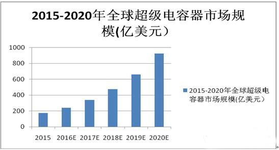 2015年全球超级电容器市场规模达到173亿美元,分析机构预计,到2020年超级电容器市场将超923亿美元,年均复合增长率达到39%。