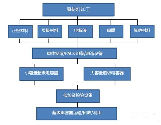 超级电容器产业链中,生产环节的原材料主要是正负电极/电解液和隔膜。其中双电层电容器的电极活性材料多为活性炭,其产业化技术主要掌握在西方发达国家手中。隔膜技术掌握在日本企业手中。电解液方面,国内暂无技术瓶颈。而其制作工艺:配料→混浆→ 制电极→裁片→组装→注液 →活化→检测→包装,整套流程的技术含量颇高,准入门槛较高。